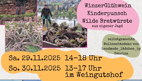 Unsere 60 Jahre alten Rebstöcke erzählen Geschichten – und jetzt könnt ihr euch ein Stück Weinbaugeschichte mit nach Hause holen! Der Erlös? Geht natürlich an einen guten Zweck! Dazu gibt’s Winzer-Glühwein, Kinderpunsch und Wildbratwürste – und ganz viel gemütliche Stimmung in unserem Weingutshof!