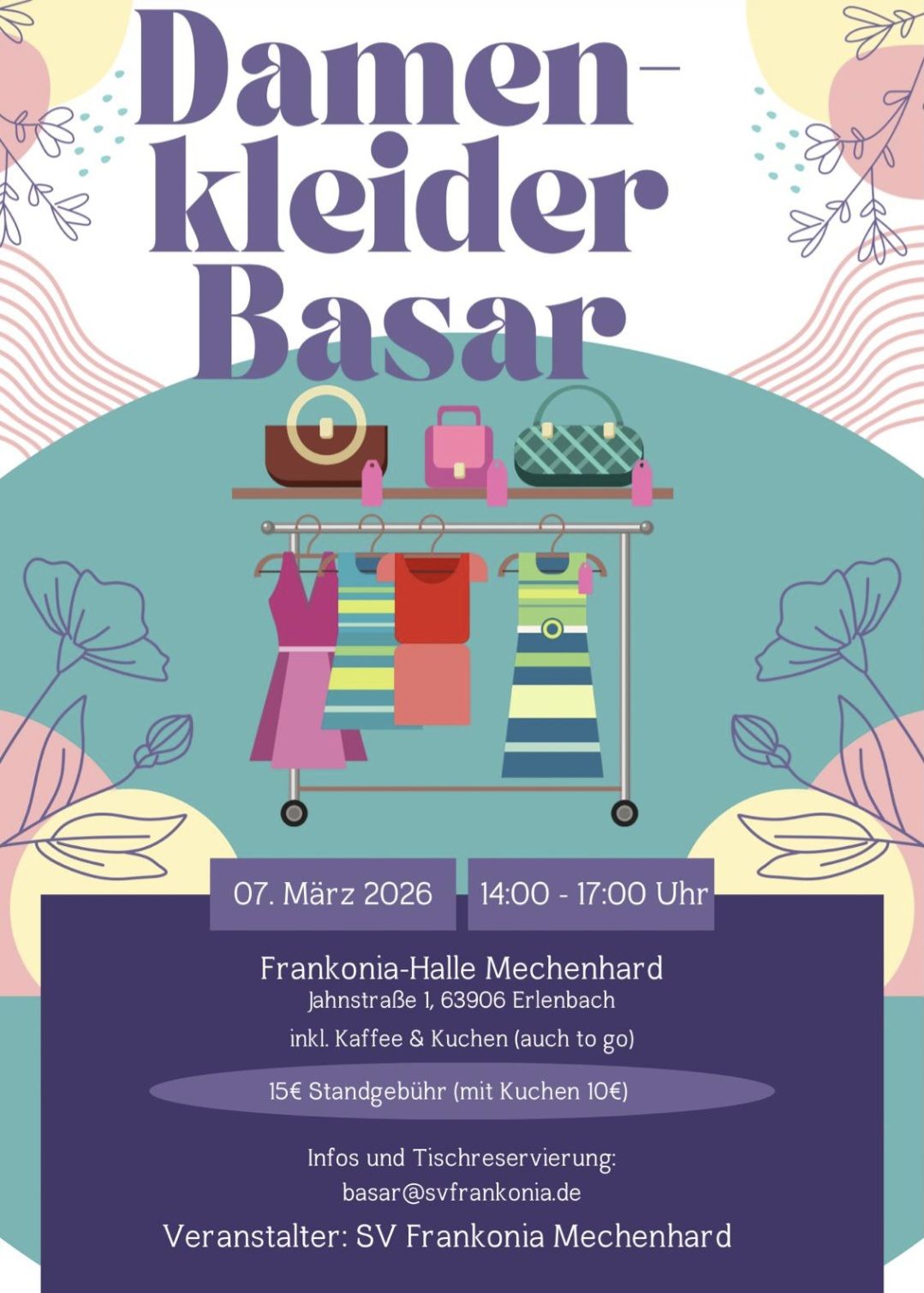 Am 7.3. findet von 14 – 17 Uhr ein Damenkleider-Basar in der Frankonia Halle statt inkl. Kaffee und Kuchen (auch to go). Standgebühr 15 € (mit Kuchen 10 €) Infos und Tischreservierung: basar@svfrankonia.de.