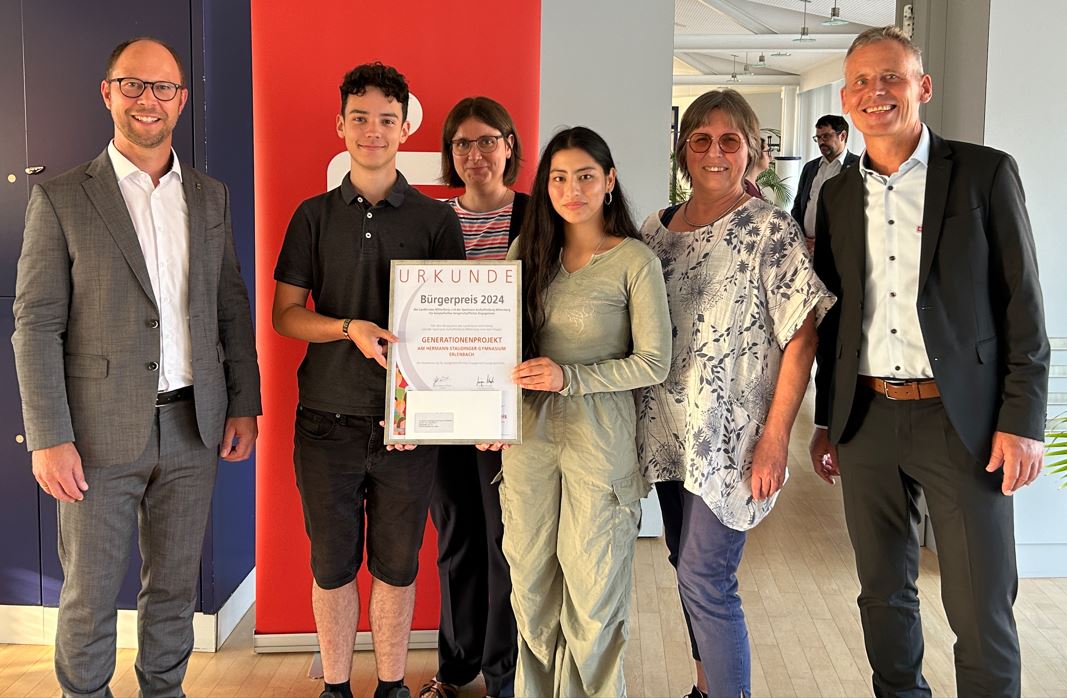 Das Projekt „Begegnung der Generationen" des Hermann-Staudinger-Gymnasiums Erlenbach erhielt in der vergangenen Woche den Bürgerpreis 2024. Dieser Preis wird von der Sparkasse Aschaffenburg-Miltenberg und dem Landkreis Miltenberg verliehen und prämiert außerordentliches bürgerschaftliches Engagement außerhalb der klassischen Vereinsarbeit.
