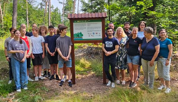 Was machen die da? Bereits im März 2023 pflanzten Schüler und Schülerinnen des HSG mit Hilfe von vielen Partnern fast 1000 Bäume. Kein leichtes Unterfangen: Sponsoren und Experten, zum Beispiel das Amt für Ernährung, Landwirtschaft und Forsten, mussten gewonnen werden, Schüler und Schülerinnen ausgebildet, Baumsorten ausgesucht und Material in den Wald transportiert werden. „Ohne die Hilfe der Klimahelden Aschaffenburg, die Setzlinge und Verbissschutz sponsorten, wäre es kaum möglich gewesen“, resümierte Markus Füller, der als Leiter der Campus N-AG am HSG alles koordinierte und steuerte. „Einfach nur Fichten pflanzen ist auch keine gute Idee“, erklärte Lenny Kreher bei der Feierstunde zur Enthüllung der Schautafel, auf der Wanderer und Radfahrer nachlesen können, dass sich vor allem Traubeneichen, Esskastanien und Winterlinden zum Aufbau eines möglichst klimaresistenten Waldes eignen. Die mehrtägige Pflanzaktion wurde dabei kulinarisch vom Elternbeirat des HSG und von der HSG-Mensa unter der Leitung von Fr. Becker sowie frischem Obst vom Kastanienhof unterstützt. Im extremen Sommer 2023 merkten die Schüler und Schülerinnen, dass es wegen der Trockenheit den Setzlingen nicht besonders gut ging. Spontan wurden Gießaktionen initiiert, u.a. von den Lehrern David Hohm und Anja Ühlein – sie kümmert sich auch rund um das HSG mir ihrer AG im Schul- und Naturgarten um mehrere Dutzend Bäume. Man nutzte im aktuellen Schuljahr Wandertage, um möglichst viele Klassen in den Wald zu führen, damit sie dort die kleinen Bäumchen gießen und retten konnten. Aber es wurde schnell klar: Auf dem Sandbuckel gibt es keine Wasserleitung. Zum Glück sprang die Stadtgärtnerei ganz unkompliziert ein und lieferte mehrere tausend Liter Wasser auf den Hügel. Auch Hr. Fries von der Firma Küchen Fries und Vater eines Schülers brachte mit seinem Tankwagen Wasser in den Wald, sodass an zwei Stellen gezapft werden konnte. Somit kam das HSG-Wäldchen gut über den Winter. Zeit, dass die Hinweistafel produziert und letztlich mit der tatkräftigen Hilfe der Stadt Erlenbach, die die nötige Schildhalterung zimmerte, aufgestellt werden konnte. Am 19.07.2024 kamen dann alle noch einmal am HSG-Wäldchen auf dem Sandbuckel zusammen, um in einer kleinen Feierstunde die Hinweistafel zu enthüllen. „Ich freue mich sehr, dass die Schüler und Schülerinnen des HSG sich ganz praktisch mit dem Thema Wald und wie man ihn schützen und erhalten kann, beschäftigen“, gratulierte Bürgermeister Christoph Becker. Die Schülersprecher des HSG lasen nach der Enthüllung die Tafel vor und anschließend gab es für alle noch eine Erfrischung. „Möge der Wald nachhaltig wachsen“, lässt uns die Tafel wissen. Was macht das HSG im Wald? Das HSG macht Wald! Vielen Dank allen Helferinnen und Helfern.